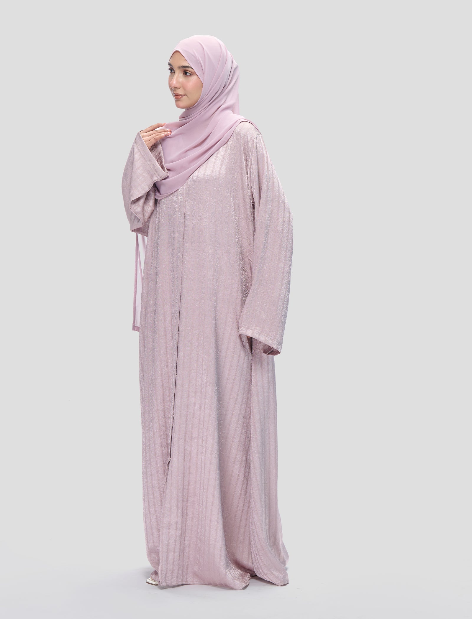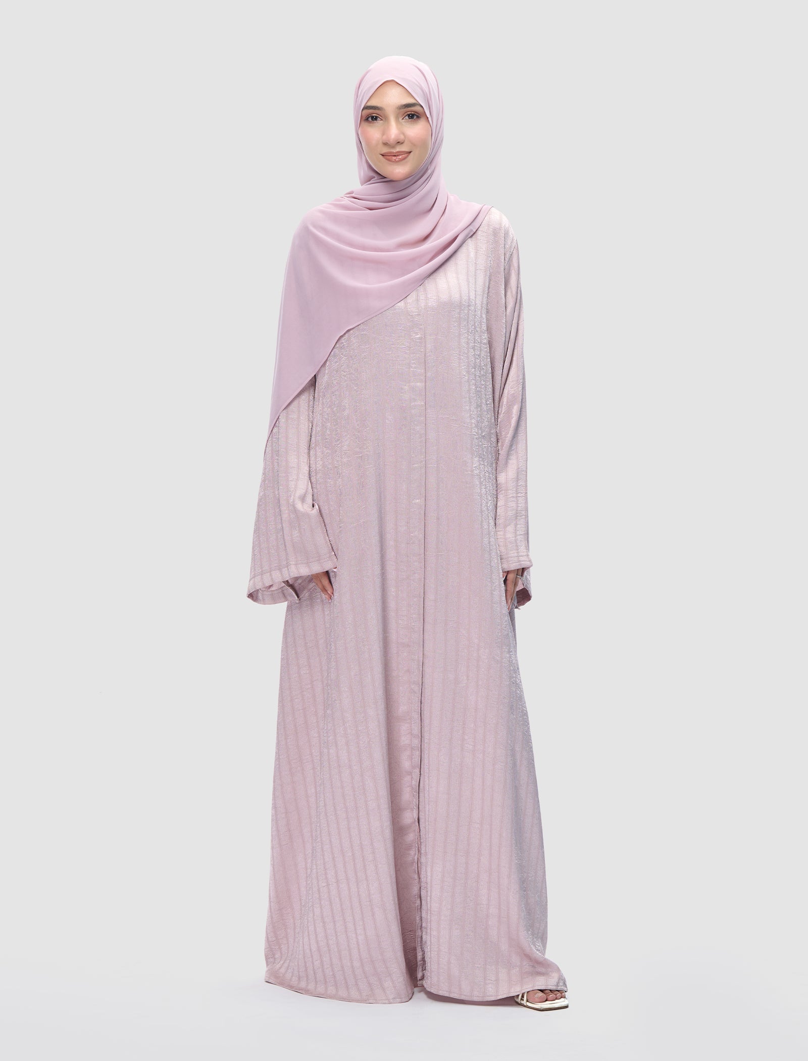 This black abaya features a relaxed fit with a subtle shiny finish for graceful movement.