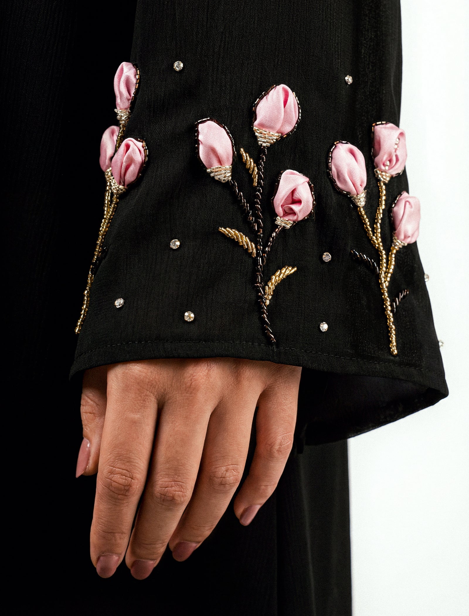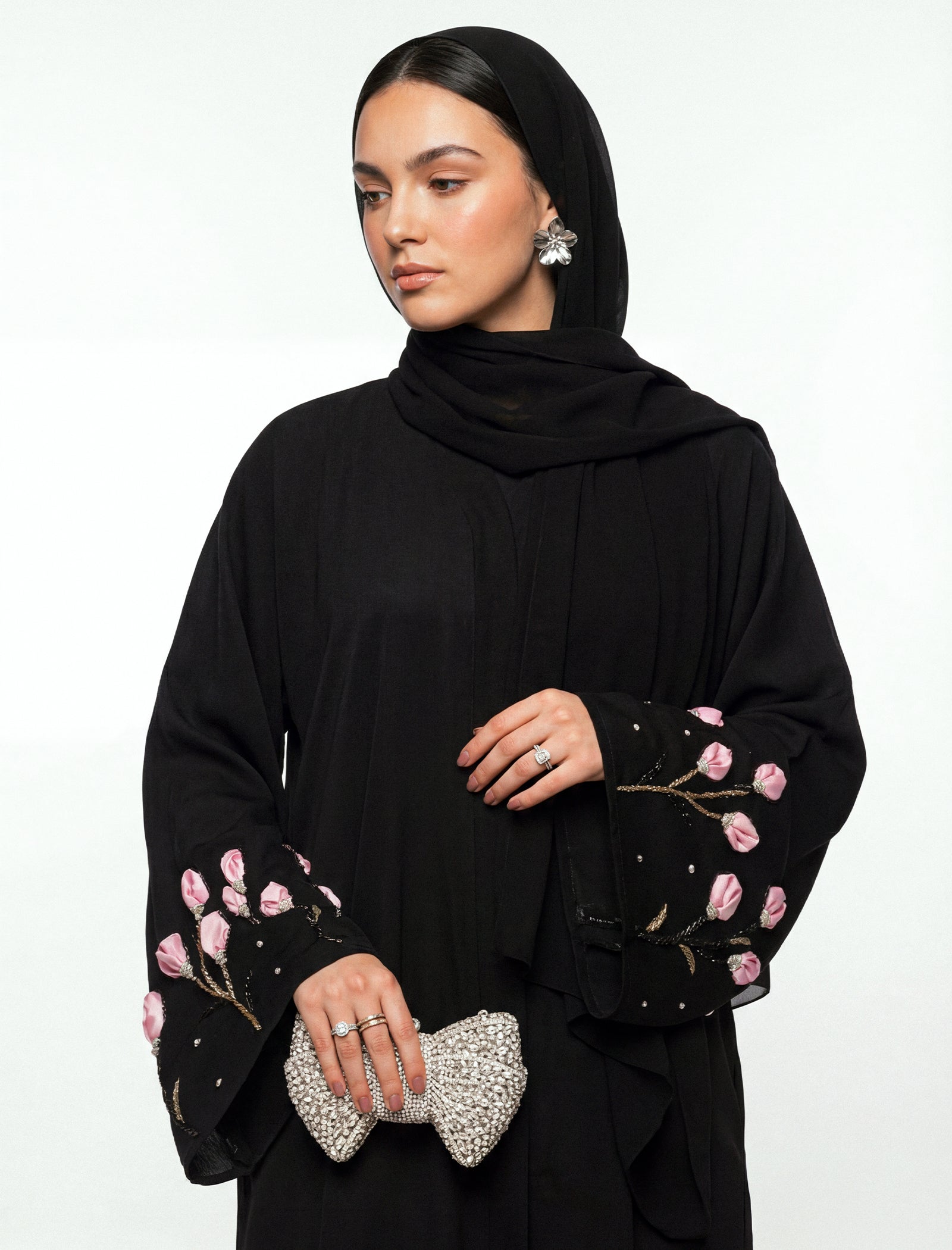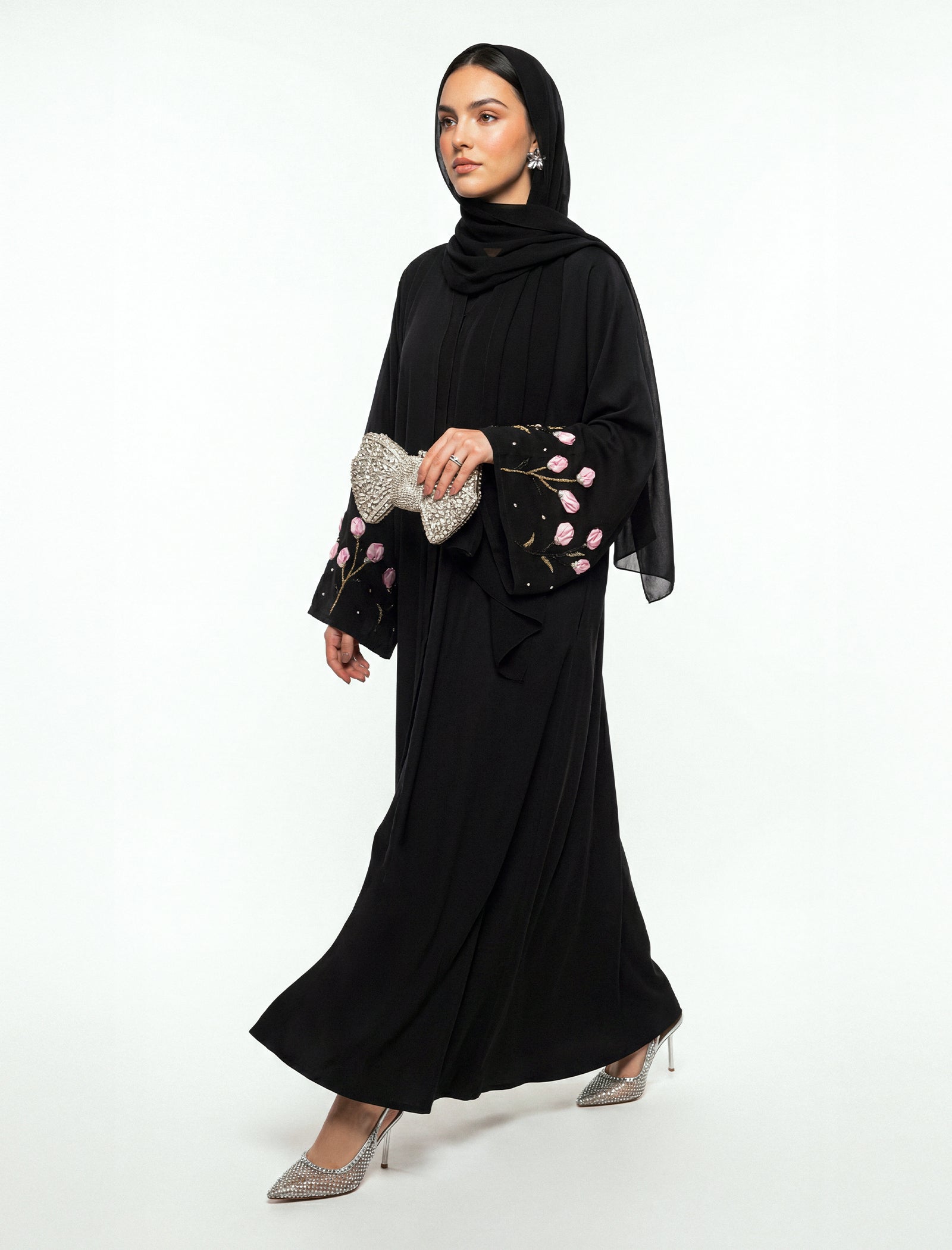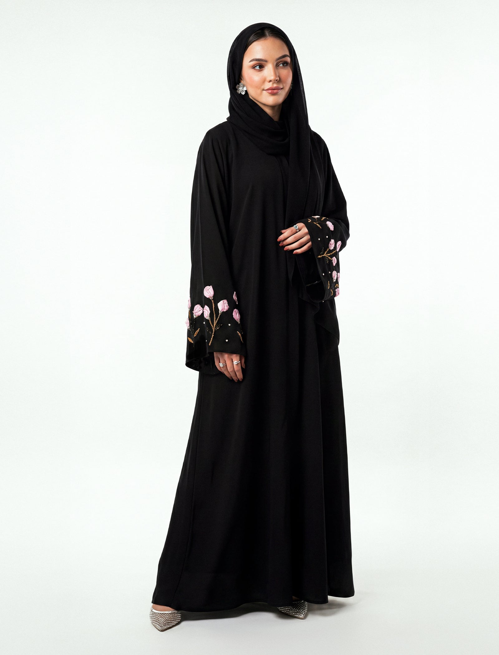 A timeless black abaya adorned with delicate floral hand embellishment on the sleeves. Subtle, graceful, and effortlessly refined.