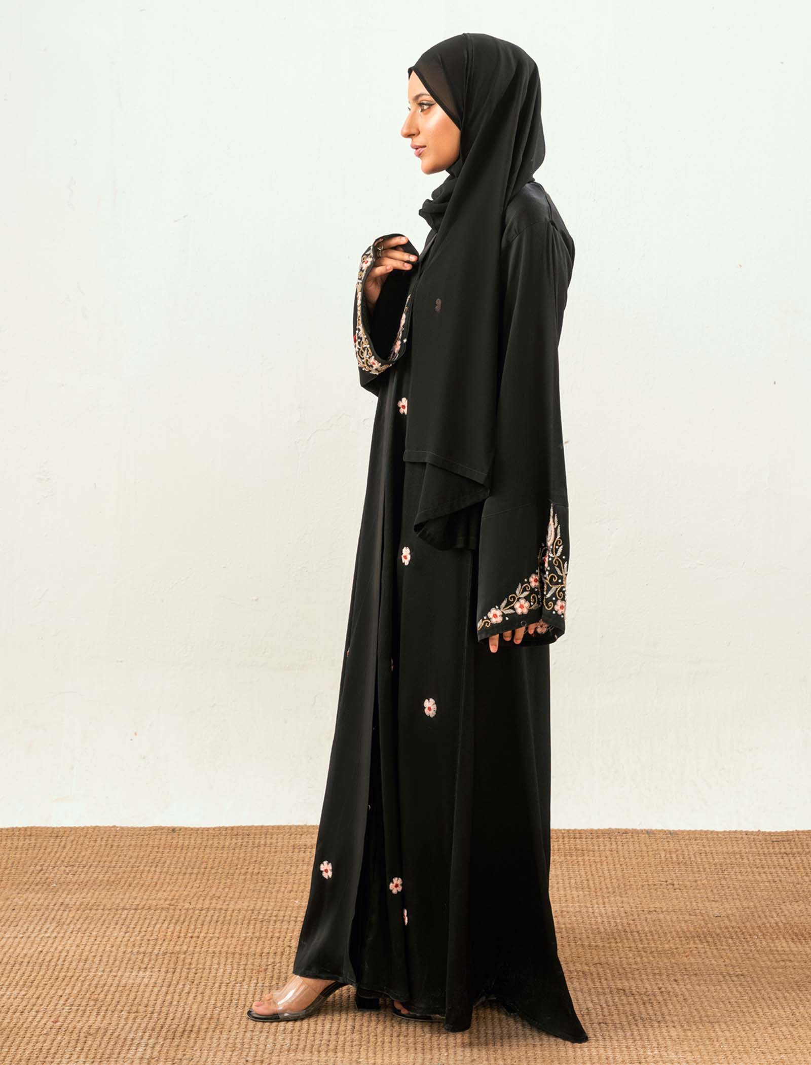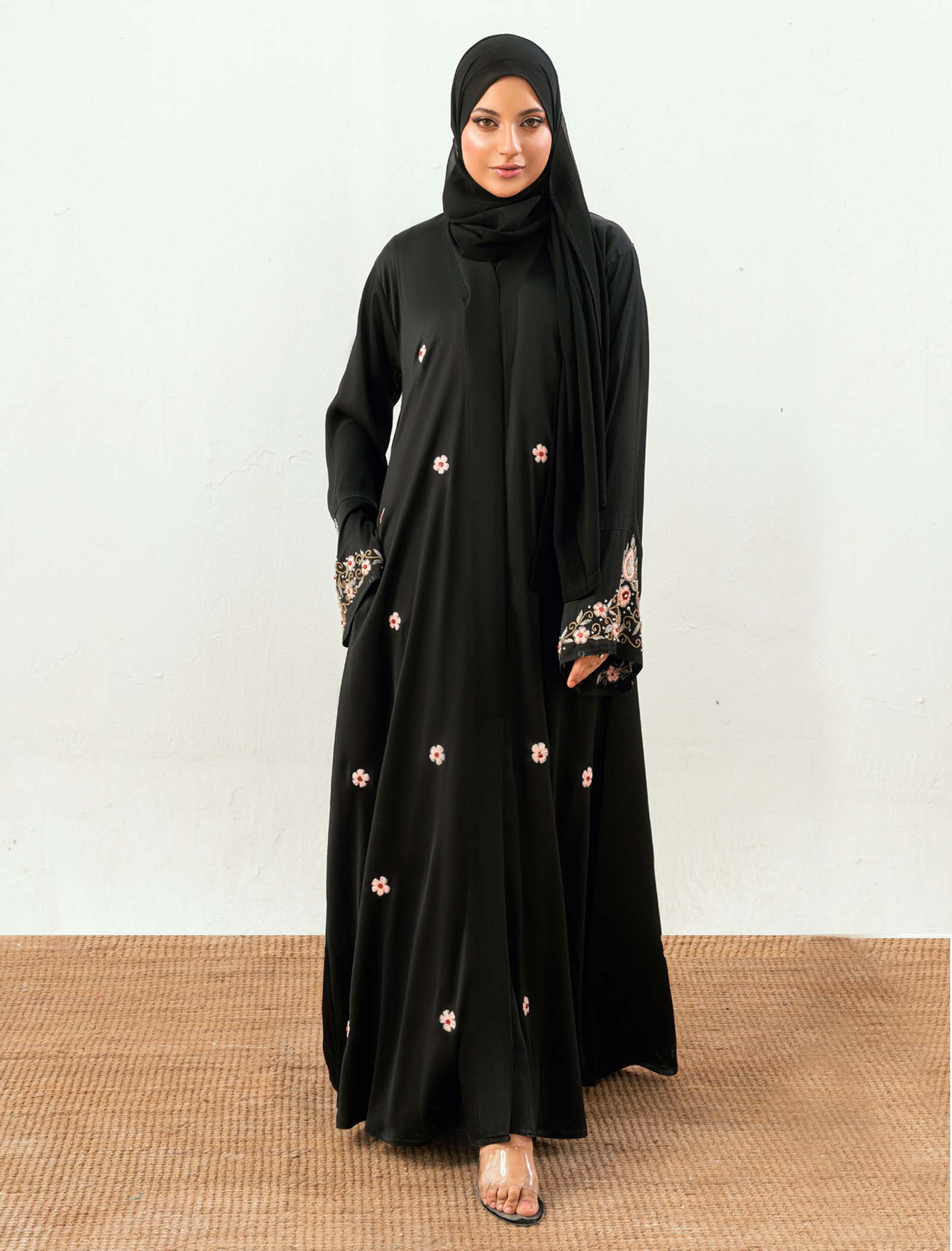 Elegant, feminine, and full of charm. The Haneen Abaya brings a graceful twist to classic black. Adorned with soft pink floral embroidery across the front and beautifully embellished sleeves, it’s the perfect choice for wedding wear or special occasions.
