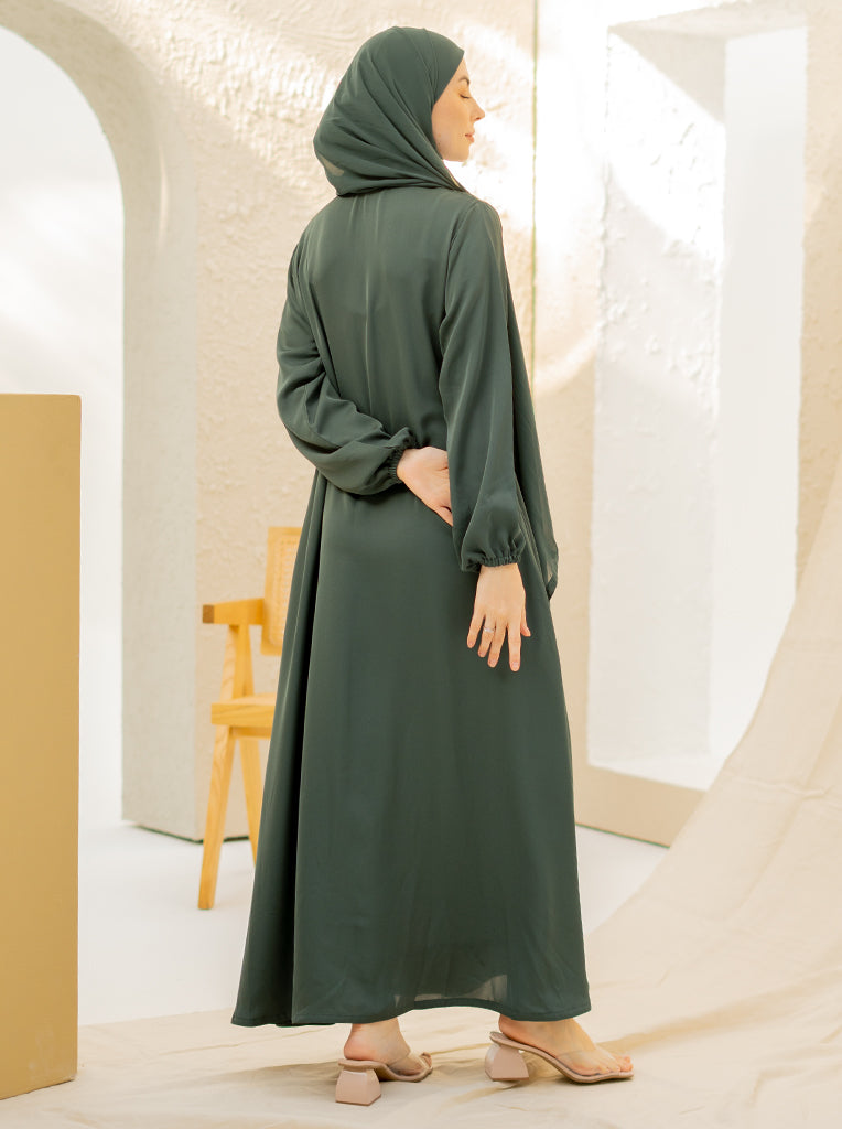 Elevate your style with our pleated front open abaya featuring tastefully matched colored fabric buttons,
