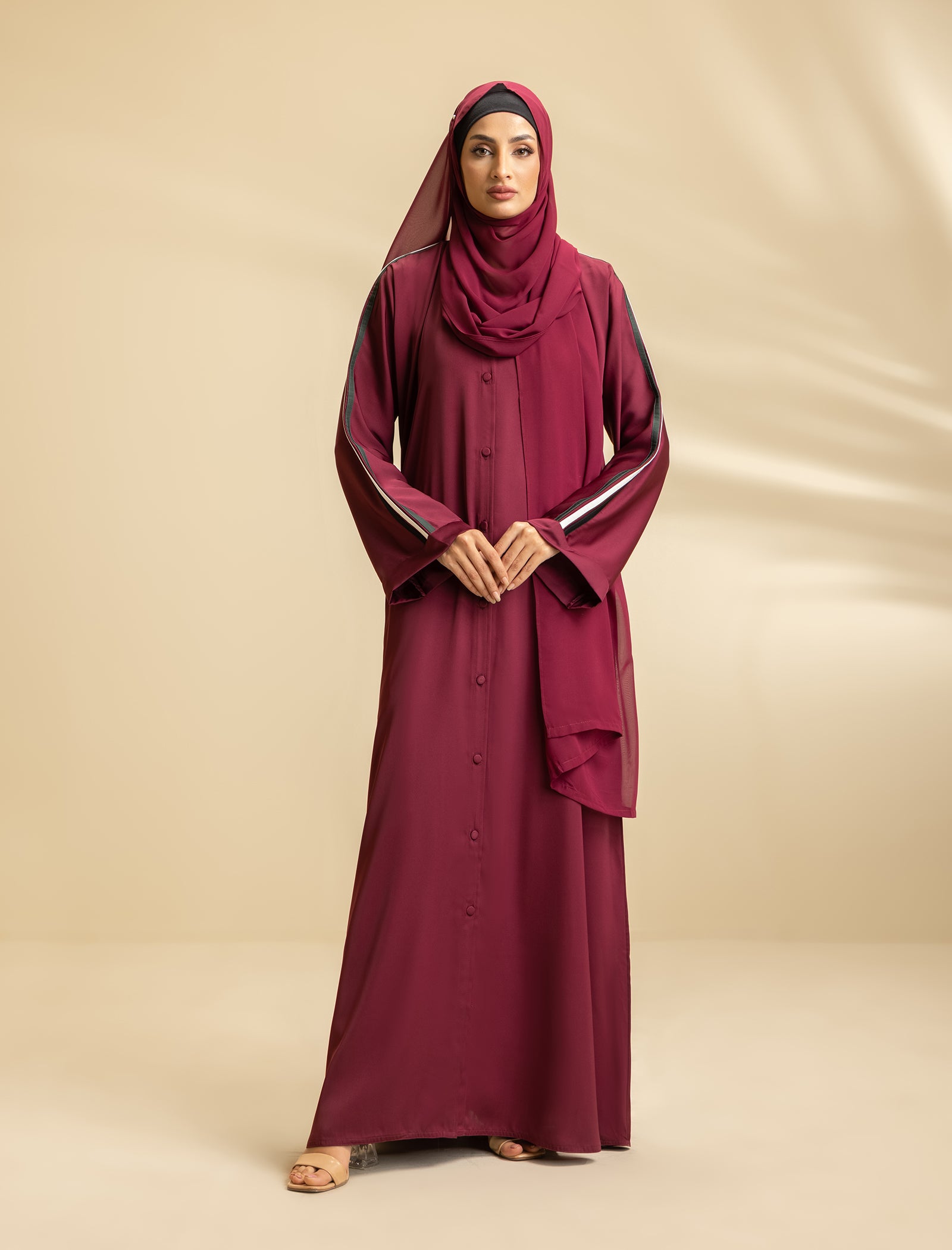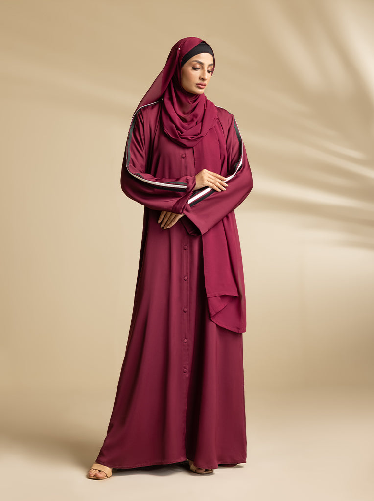 Design: Front-open button-down abaya with bold colored stripes inspired by the Palestinian cause.