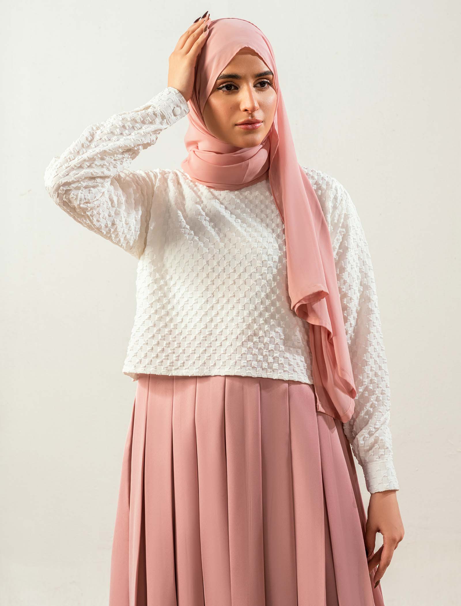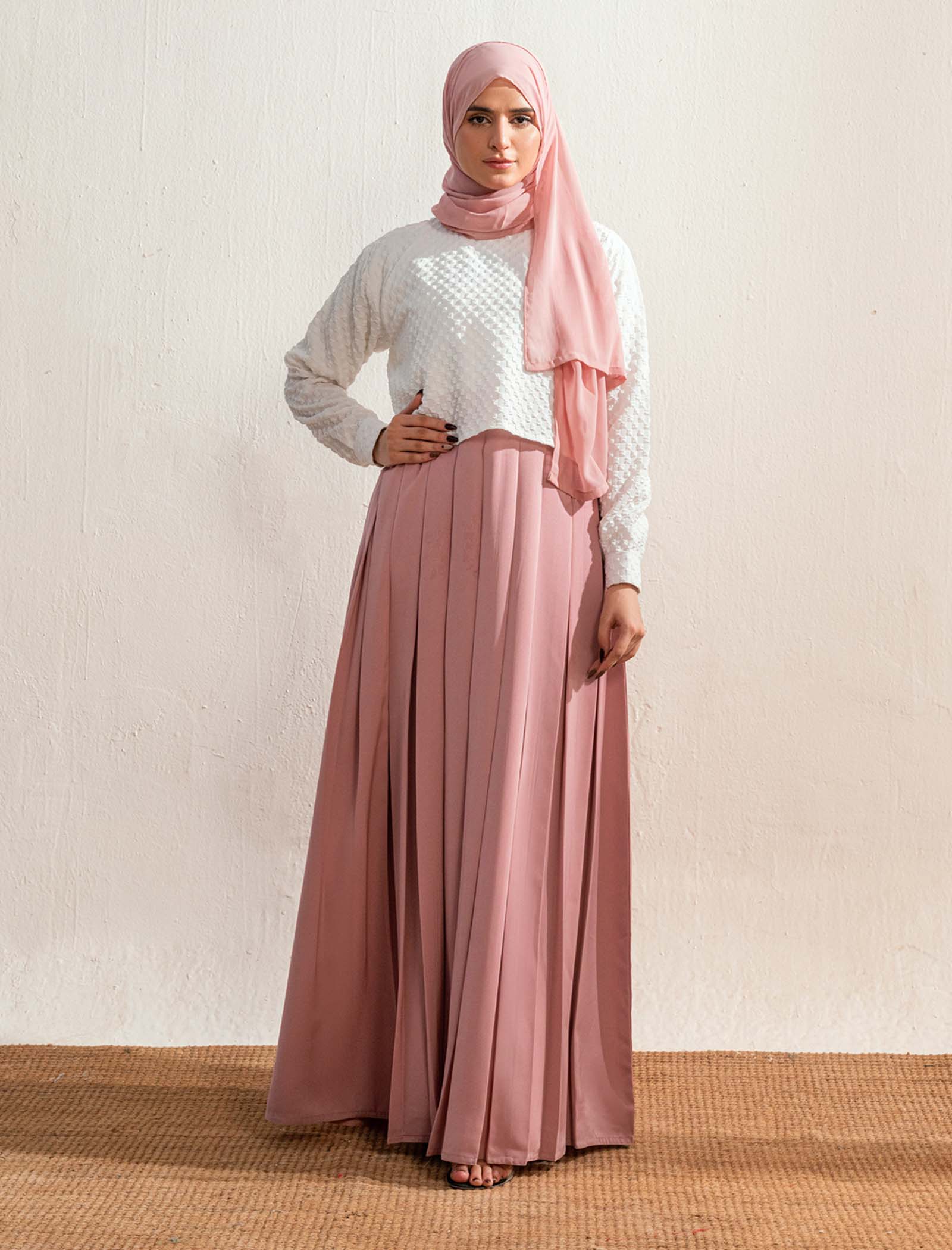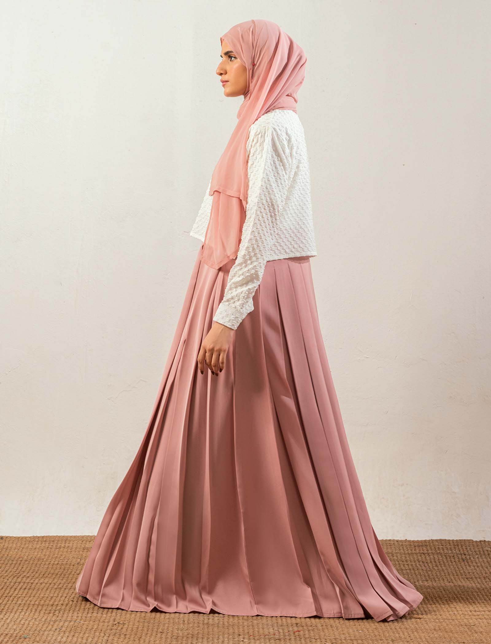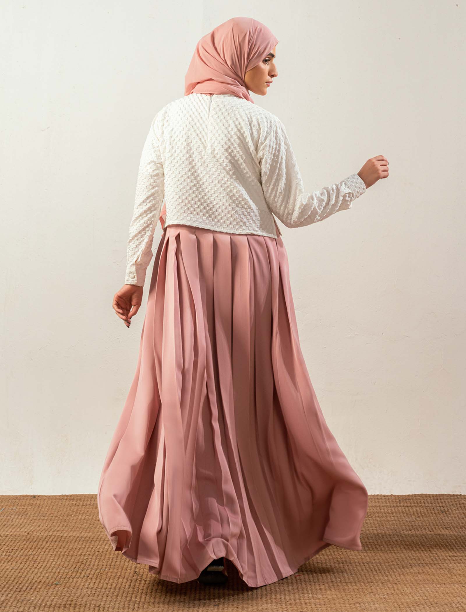 Chic meets modest in this one-piece inspired abaya featuring a beautifully pleated blush pink skirt and a textured white top. It is ideal for special gatherings, Eid, or semi-formal occasions.