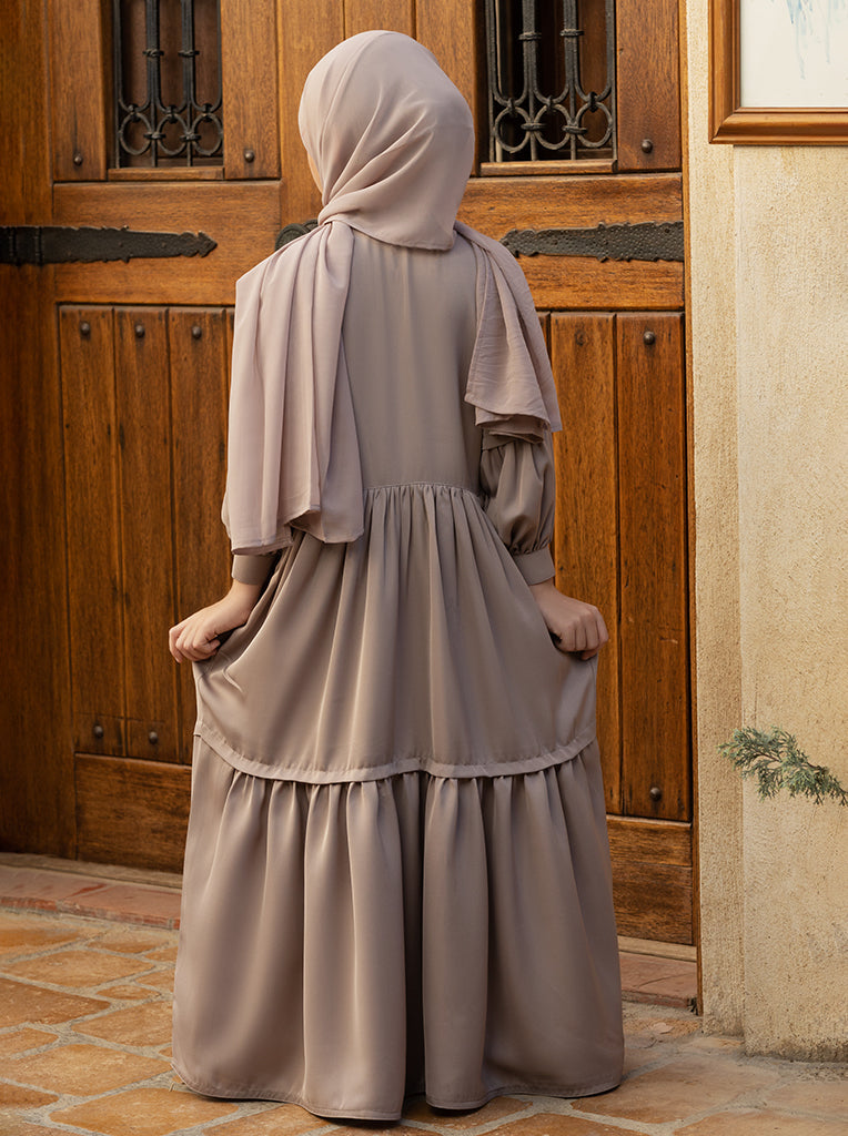Drape your little one in pure sophistication, meticulously crafted from luxurious Saudi Nidah fabric, this ensemble boasts a front-open design. With its pleats and cuts adding a touch of grace, the abaya is adorned with fabric-colored buttons that accentuate its charm. The cuff sleeves add an extra layer of refinement to this exquisite piece. Each set is thoughtfully completed with a perfectly matching scarf.