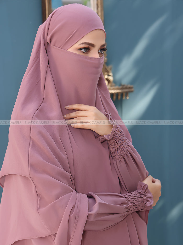 Shanaz is a 2 piece abaya which has a khimar on top along with a maxi, It is your first choice for modest fashion, A beautiful cut of the khimar made in georgette chiffon fabric with multiple layers is the highlight of the product. Maxi is made in Saudi Nidah fabric. Niqab can be pulled down the chin when necessary.