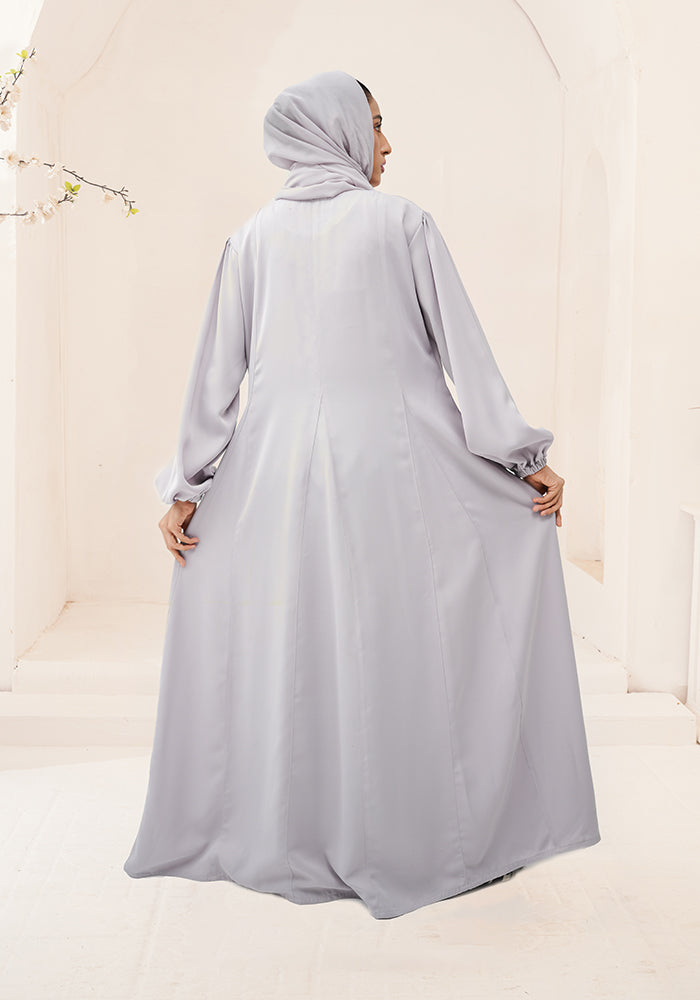 Add a touch of elegance to your summer with our pastel lilac front open abaya. The multiple chiffon kalis at the back provide a flowing look, and the abaya comes with a matching scarf and side pocket, ensuring both style and functionality.