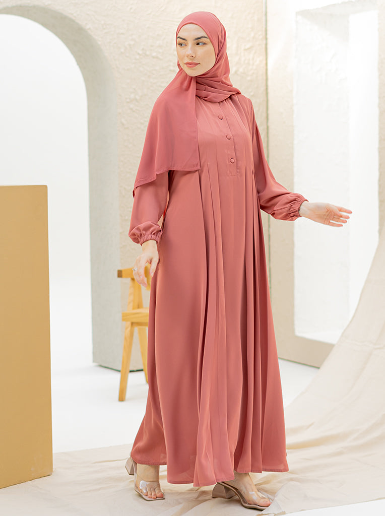 Maxi abaya with elastic sleeves. Its beautiful neckline with fabric buttons makes it a perfect daily wear product.
